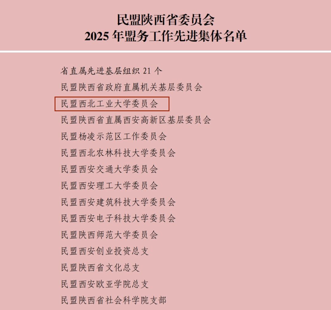 2026年1月17日至18日,民盟陕西省第十三届委员会第四次全体会议在西安召开。会议对2025年度盟务工作先进集体和先进个人进行了表彰。民盟西工大委员会荣获民盟陕西省委员会“2025年度盟务工作先进基层组织”称号;张卓、柳桢等多位盟员荣获“2025年度盟务工作先进个人”称号。2025年,民盟西工大委员会坚持以习近平新时代中国特色社会主义思想为指导,深入学习贯彻中共二十大和二十届历次全会精神,在思想宣传、组织建设、参政议...
